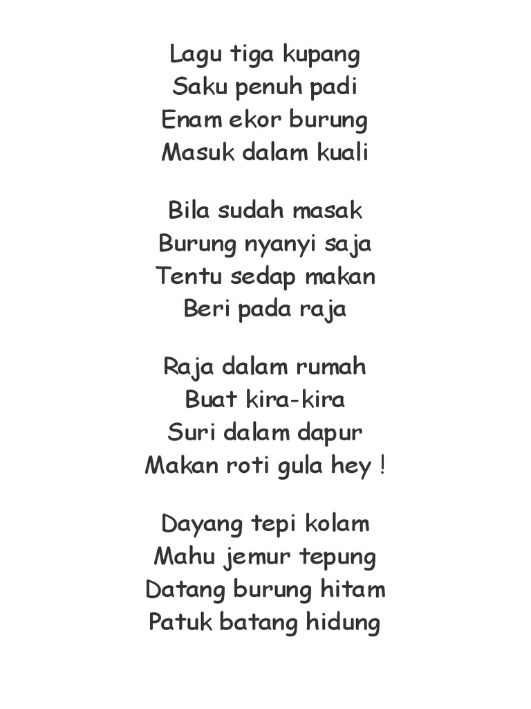 Lagu tiga kupang Childrens Song Malay Lagu tiga kupang Saku penuh padi Enam ekor burung Masuk dalam kuali Bila sudah masak Burung nyanyi saja Tentu sedap makan Beri pada raja Korus Raja dalam rumah Buat kira-kira Suri dalam rumah Makan roti gula hey. Wednesday 23 November 2011 Wednesday November 23 2011 0 candie blossom. Lagu tiga kupangSagu penuh padiEnam ekor burungMasuk dalam kualiBila sudah masakBurung nyanyi sajaTentu sedap makanBeri pada rajaRaja dalam rumahBuat kira-ki.